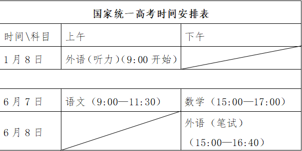 (一)国家统一高考。国家统一高考科目使用全国统一命题试卷,考试时间安排在6月7日全天和6月8日下午,其中语文考试时间为150分钟,数学考试时间为120分钟,外语(笔试)考试时间为100分钟;外语(听力)考试安排在1月8日上午,连续组织两次,每次考试时长约20分钟,考试成绩取两次中的高分计入外语科目成绩。