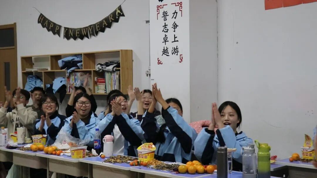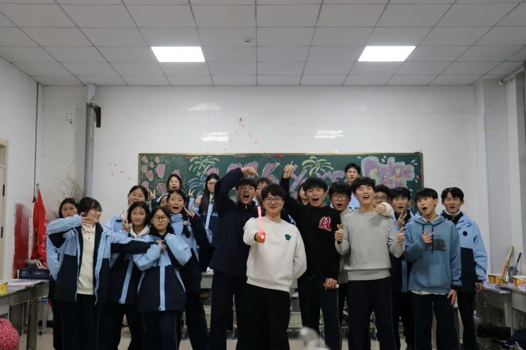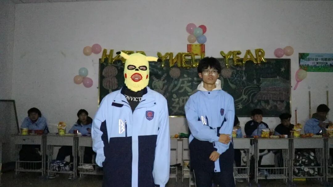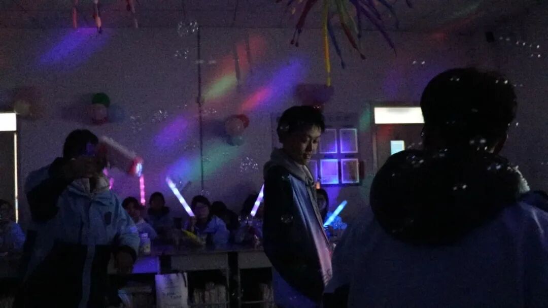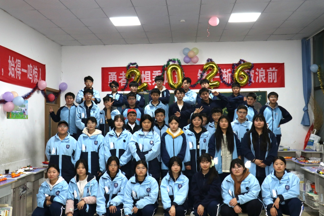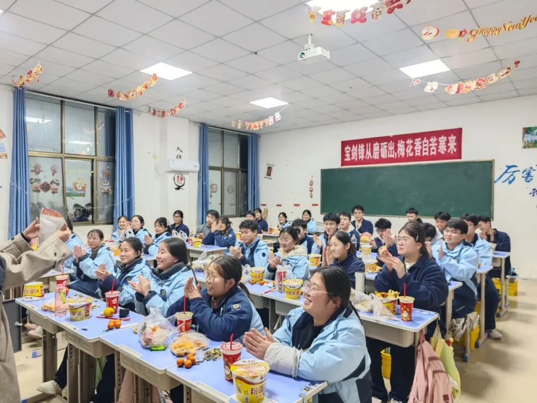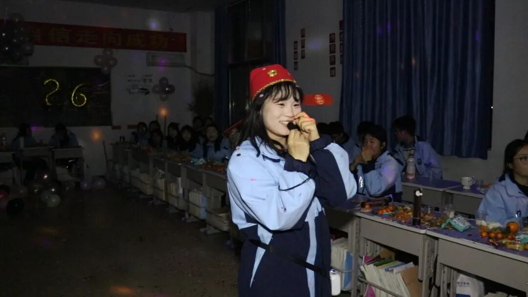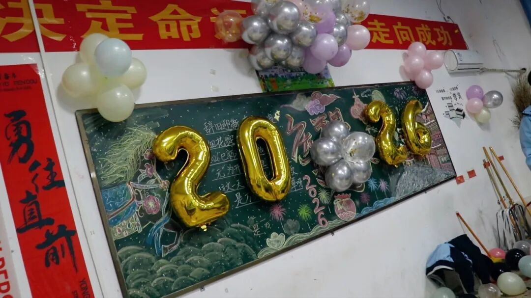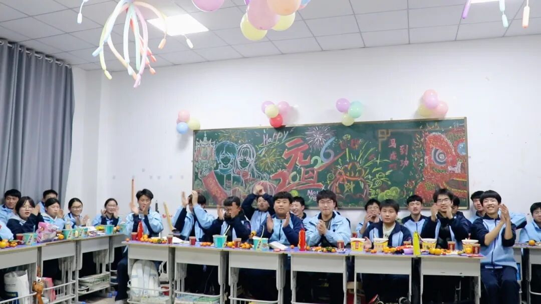 夜幕降临,平日整齐严肃的教室变身为五彩缤纷的联欢舞台。彩带、气球、窗花点缀其间,黑板报上是同学们亲手绘制的“你好,2026”。简单的装饰,承载着大家对新年最真挚的期待。